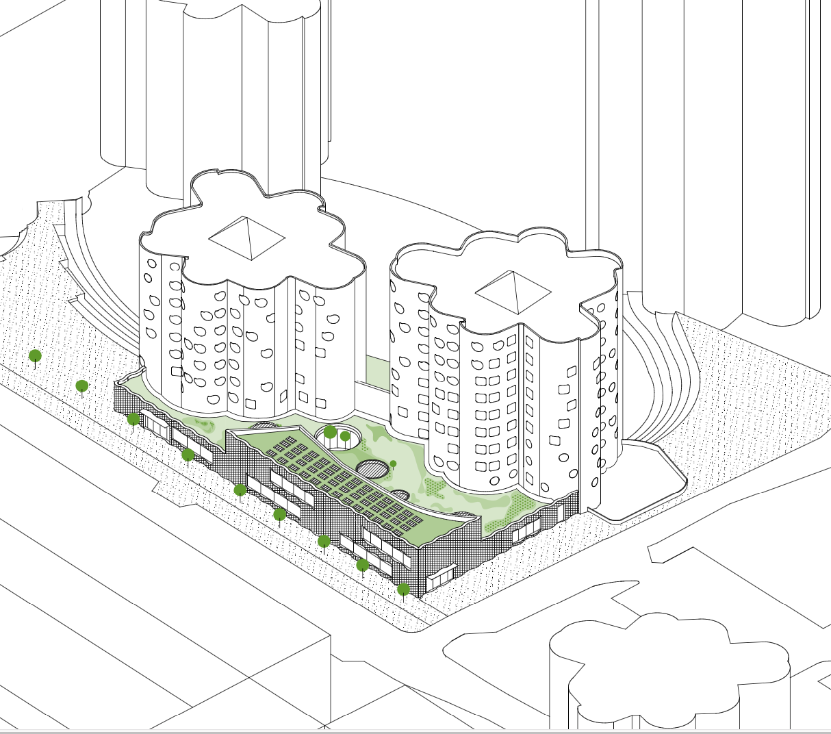 Notre approche n’est pas celle de concurrencer les Tour Aillaud, mais de les mettre en valeur . Nous nous attachons à un renvoi morphologique autour des formes rondes et répétitives. Les tours ne se caractérisent pas uniquement par leur dessin «libre» mais également par leur textures et couleurs. Pour cela, dans cette logique de dialogue, si nous empruntons des codes existants et nous les diversifions, nous souhaitons permettre une relation compréhensible à travers :