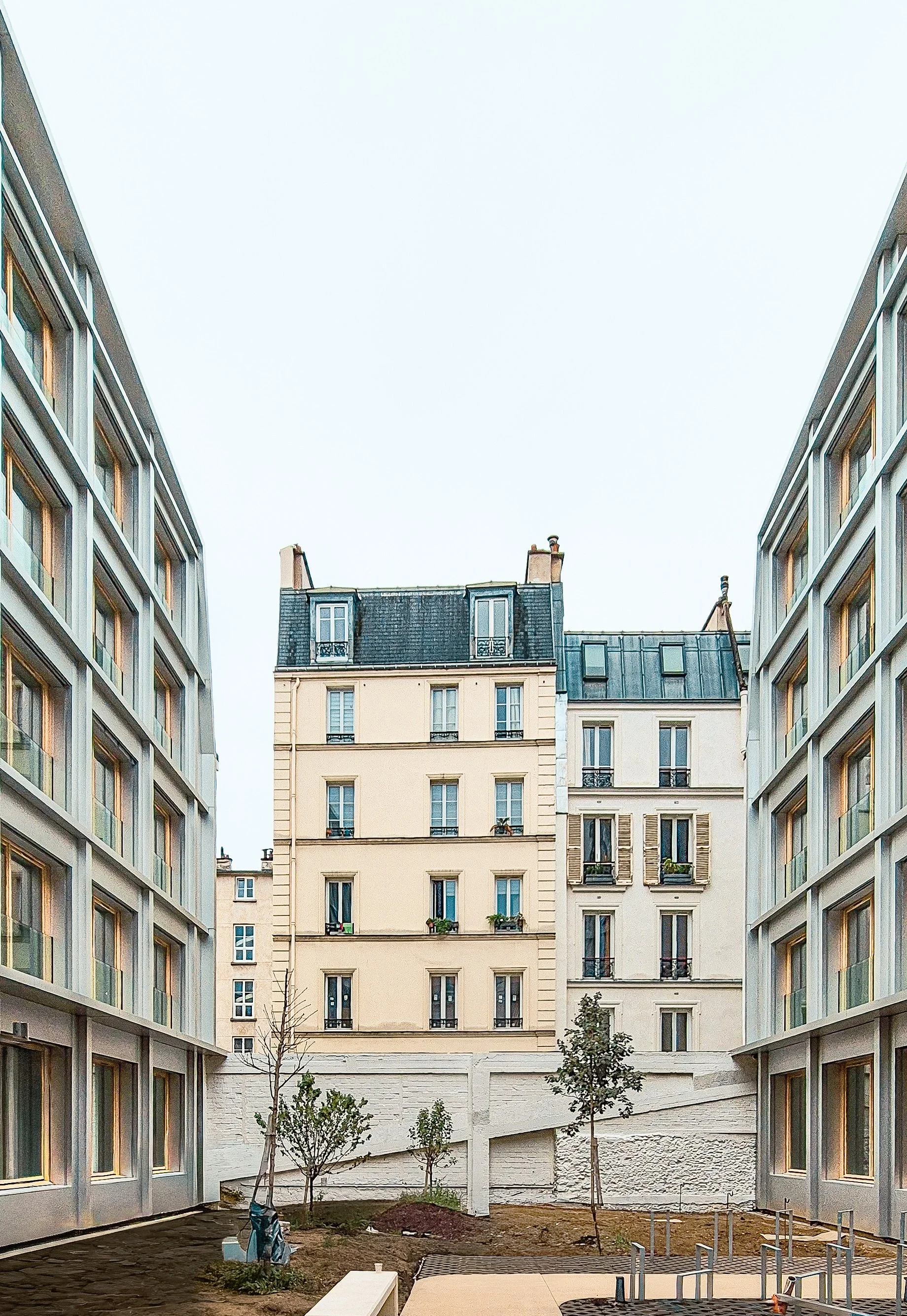 La parcelle est très enclavée et jouxte 8 autres copropriétés dont les profondeurs de vue se trouvent limitées. L’ensemble du bâtiment existant se compose d’un bâtiment rue et d’un bâtiment principal en coeur d’îlot. Il nous semble très compliqué de considérer qu’une démolition totale avec reconstruction soit la meilleure solution. La parcelle étant totalement enclavée, une nouvelle construction ne serait que le résultat contraignant des lignes de prospects. Cela engendrerait des vues et des retraits en vis à vis direct avec les héberges voisines et serait propice aux recours.